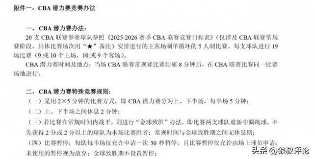北京时间12月21日,涉及到新赛季CBA出新规,各队都将和其他19个对手在常规赛结束后8分钟额外进行1场潜力赛。 具体比赛规则如下:常规时间全部结束后的8分钟,双方将进行分为上下半