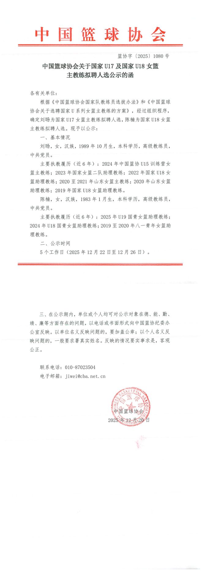 近日,中国篮协公示了中国U17、U18女篮的新任主教练拟聘人选,分别是刘旸和陈楠。