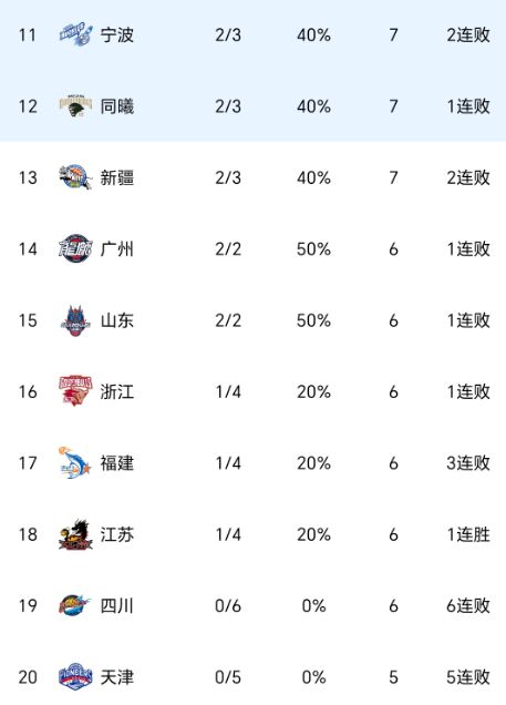 从以上积分榜来看,联盟只有北京队、广东队开局五连胜,吉林队多赛一轮4胜2负升入第三,青岛队、辽宁队、广厦队、山西队都是4胜1负的战绩。此外,全败球队仅剩天津队、四川队。
