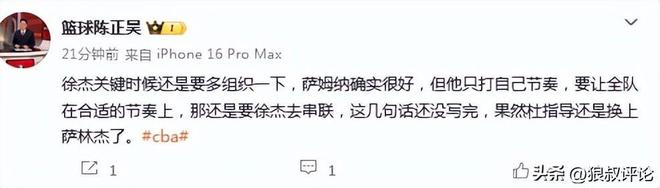 除了徐杰之外,萨林杰的两记错位中距离也很关键,上一场广东队被浙江队大外援支配,今天将同样的套路用在了深圳队身上。深圳队今晚三分球42投17中,如果换一个非第一梯队的对手,这样的手感恐怕其他队很难招架得住。”