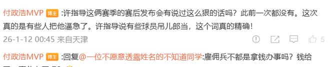 媒体人付政浩则表示:许指导这俩赛季的赛后发布会有说过这么狠的话吗?此前一次都没有。这次真的是有些人把他逼急了。许指导说有些球员吊儿郎当,这个词真的精确!