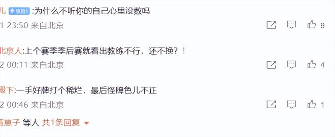 对于许指导赛后的多番言论,赛后球迷们也是发表了不同意见,有球迷表示:“一个教练说这样的话肯定是更衣室爆炸了,球员自己完全不听他的了,离下课不远了”,还有球迷则认为:球员们为什么不听你的自己心里没数吗?一手好牌打个稀烂,最后怪牌色儿不正。