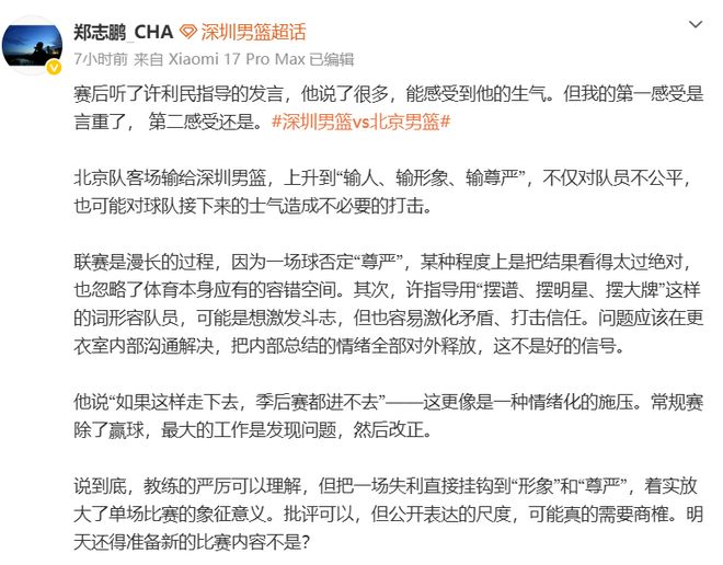 对此,媒体人郑志鹏发表了不同意见,郑老师认为:能感受到许利民的生气,但我的第一感受是言重了, 第二感受是北京队客场输给深圳,上升到“输人、输形象、输尊严”,不仅对队员不公平,也可能对球队接下来的士气造成不必要的打击。联赛是漫长的过程,因为一场球否定“尊严”,某种程度上是把结果看得太过绝对,也忽略了体育本身应有的容错空间。