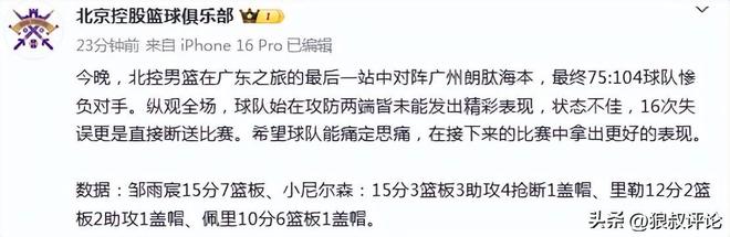 CBA常规赛第16轮,北控客场以75-104不敌广州。首节比赛被对手得了30分,在场球员没有一次犯规,三节比赛就结束比赛悬念,末节战意全无,全队只得到13分,最终惨负29分引发球迷的热议。