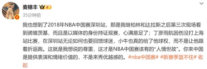 对此,媒体人麦穗丰社媒发文吐槽,NBA球队来中国是提供表演和情绪价值的,不是来秀优越感的。
