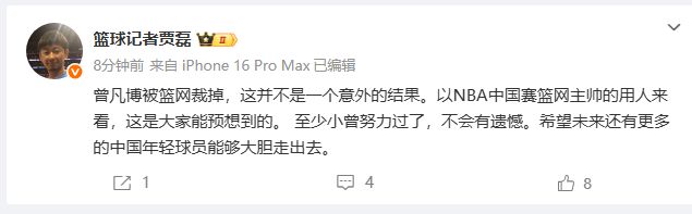 媒体人贾磊:曾凡博被篮网裁掉,这并不是一个意外的结果。以NBA中国赛篮网主帅的用人来看,这是大家能预想到的。 至少小曾努力过了,不会有遗憾。希望未来还有更多的中国年轻球员能够大胆走出去。