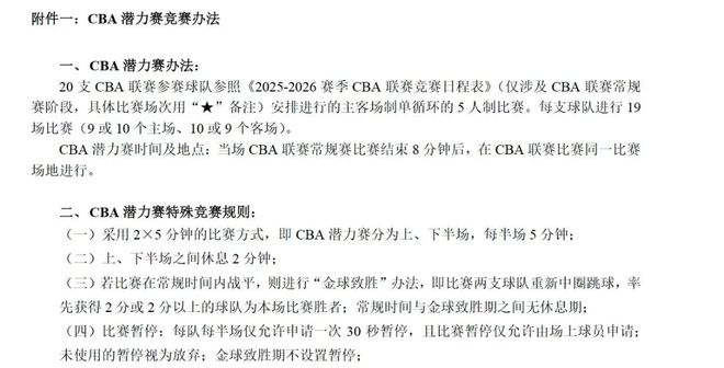 中国篮协的一纸公告让整个篮球圈炸开锅!2025-26赛季CBA联赛将迎来史上最颠覆性改革:常规赛每节时间从12分钟缩短至10分钟,更震撼的是新增设“第五节”——专属替补球员的“CBA
