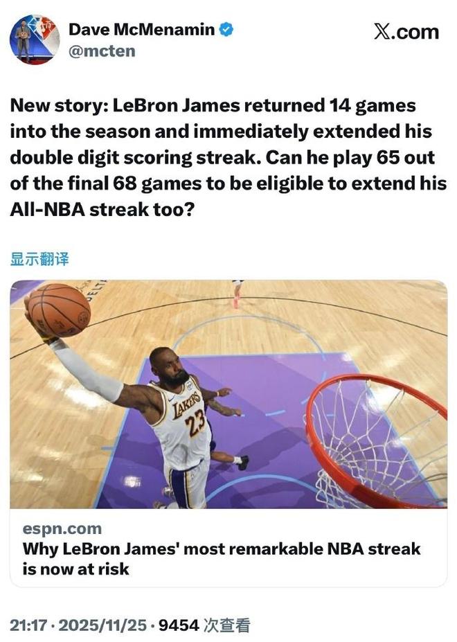 詹姆斯在赛季初期,已经因为坐骨神经痛缺席前14场比赛,因此他如果想要参加评奖,他剩余的比赛最多只能缺席3场,无疑是极为残酷的事实。