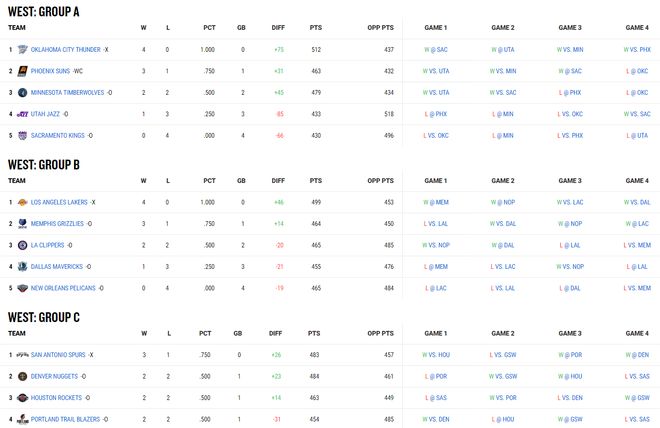 西部这边雷霆、湖人、马刺都是以小组第一身份晋级八强,只有太阳队是以小组第二战绩最好(净胜分最多)晋级八强,湖人、雷霆都是四连胜但因为雷霆净胜分+75更高所以雷霆是一号种子。