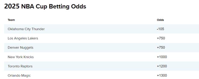 根据最新的杯赛夺冠赔率,雷霆-105断崖第一,湖人+750第二,掘金+750第三,尼克斯+1000第四,猛龙+1200第五,魔术+1300第六,雷霆这个领先的幅度还是无比之大。