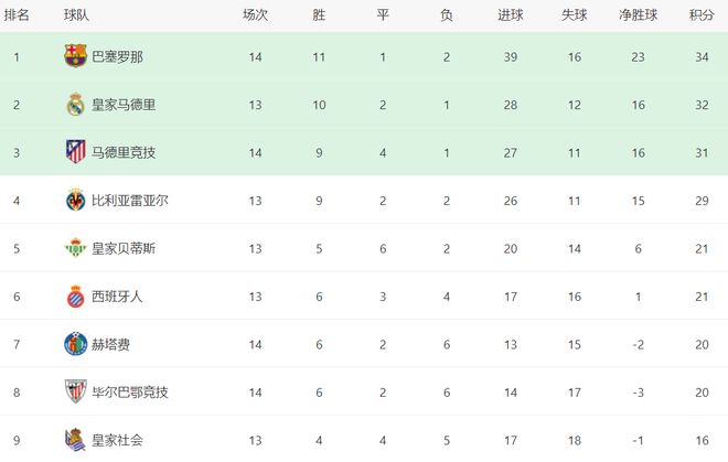 在积分榜上,巴萨以34分排名榜首。而32分的皇马掉到第2名。马竞赢球之后,总积分达到31分,升到第3名。前3的最大分差只有3分,竞争白热化。不过,皇马比巴萨和马竞少踢1场。如果接下来与赫罗纳的比赛获胜,皇马就能够重登榜首位置。比利亚雷亚尔以29分排名第4。第5的是皇家贝蒂斯,拿到21分。西班牙人也是21分,排名第6。
