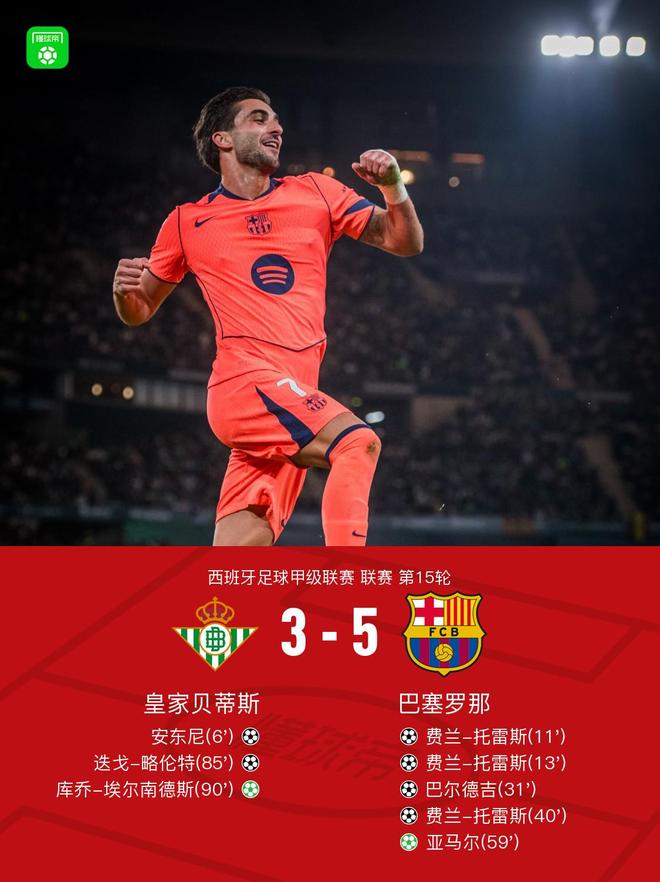 剑南春巴萨53贝蒂斯迎西甲6连胜,费兰戴帽,亚马尔点射