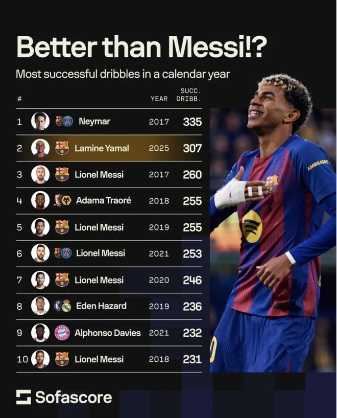 最近Sofa score发布了自然年成功过人次数最多榜单。榜单里,内马尔在2017年做到335次,亚马尔在2025年冲到307次,单看数字已经是“历史级”的高位。更扎眼的是梅西在前10里出现了