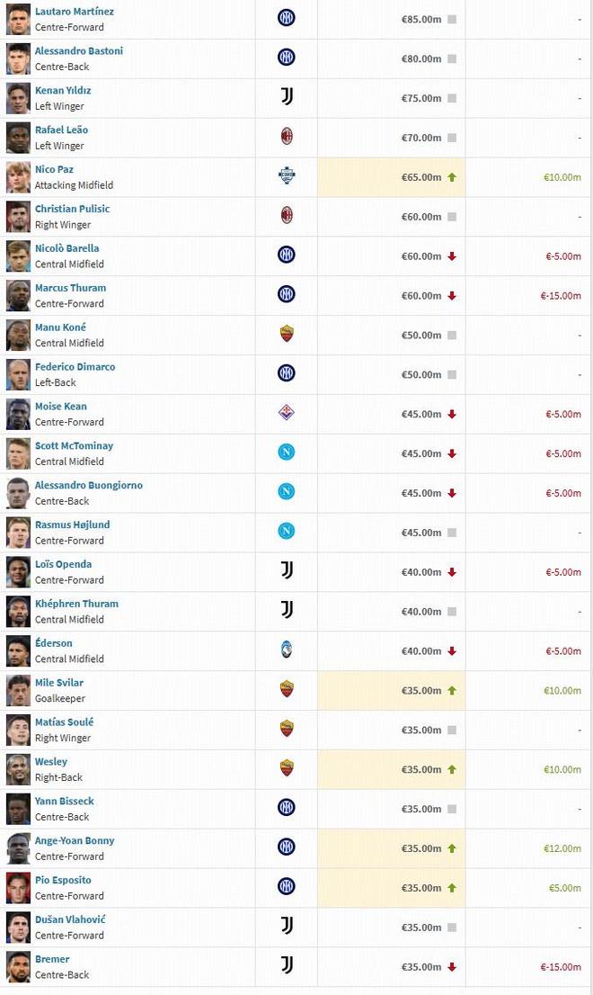 北京时间12月23日,意甲身价更新:劳塔罗8500万欧居首,尼科-帕斯涨至6500万欧。