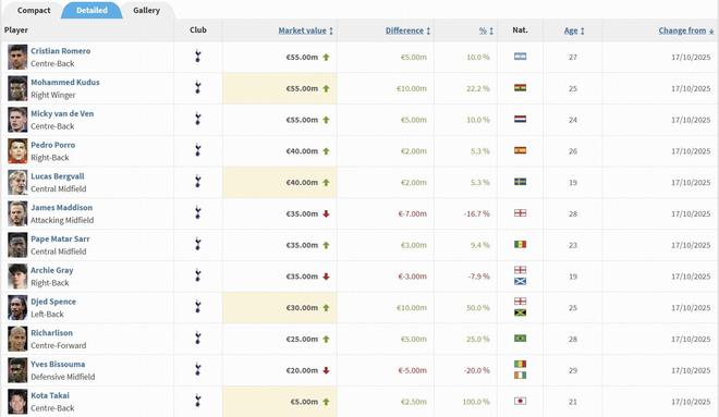 北京时间10月17日,德转更新了英超球员身价,热刺身价变动球员如下。