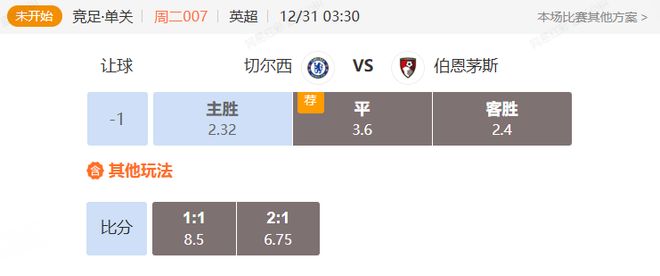 综合来看,本场比赛我倾向于伯恩茅斯最多输一球,竞彩选择让球玩法平+负,预测比分2:1或1:1。