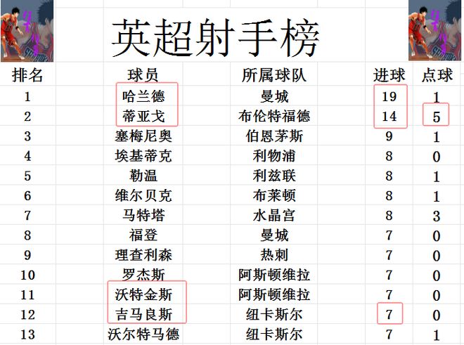 射手榜方面,哈兰德错失良机未能进球,还是19球领跑。蒂亚戈今天上演帽子戏法,大幅度缩小和哈兰德差距,5球之差仍排第2。吉马良斯今天打入一球,追上福登,理查利森,罗杰斯等人7球刚好挤入前十。