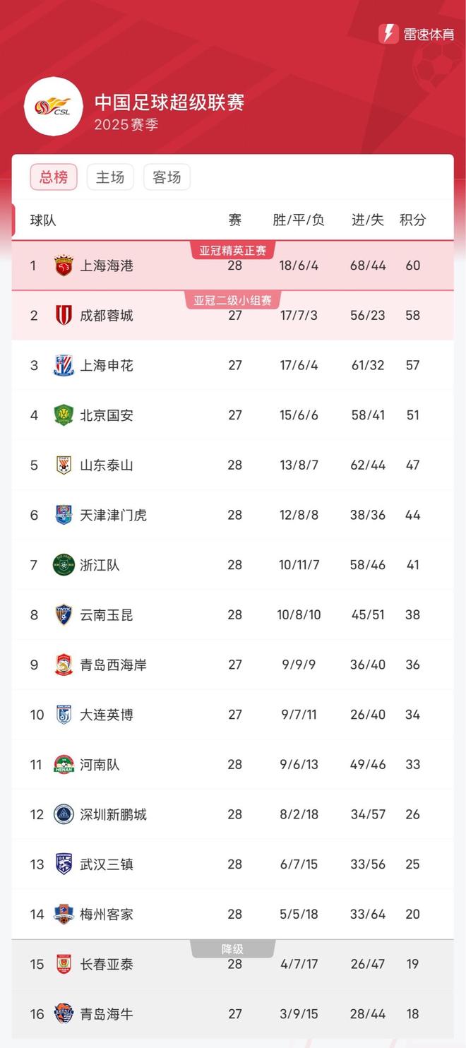 中超实时积分:海港2分领先,蓉城取胜则升榜首,申花暂第三
